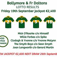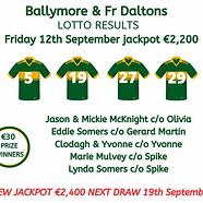 Fr. Daltons/Ballymore Gaa lotto results from the 12th of September. Next Jackpot €2,400 on Fri...