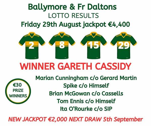 Lotto Draw results from the 29th of August. Congratulations to Gareth Cassidy on is win. New Jackpot of €2,000 Friday the 3rd September in McCawleys.