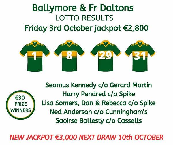 Fr. Daltons/Ballymore Gaa Lotto Results from the 3rd of October 2025. No outright Winner. Next Jackpot €3,000 on Friday the 10th of October in Cassells.
