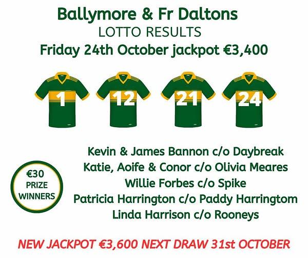 Fr. Daltons/Ballymore GAA Lotto results from the 24th of October 2025. Np outright Winner, Next Jackpot €3,600 on Friday the 31st of October 2025.