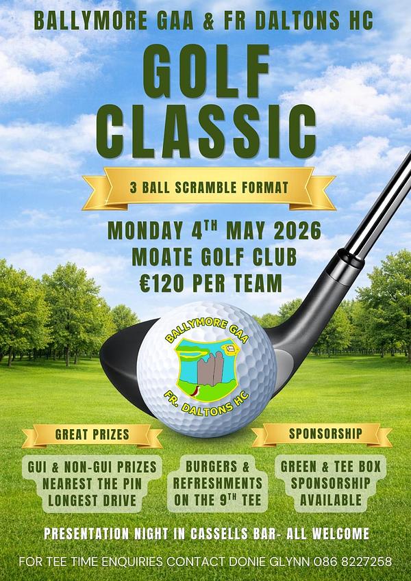 Fr Daltons Hurling Club and Ballymore GAA Football Club will be hosting a fundraising Golf Classic on Bank Holiday Monday 4th May in Moate Golf Club. Sponsorship & team entry still available, options below. Contact any committee member if interested.